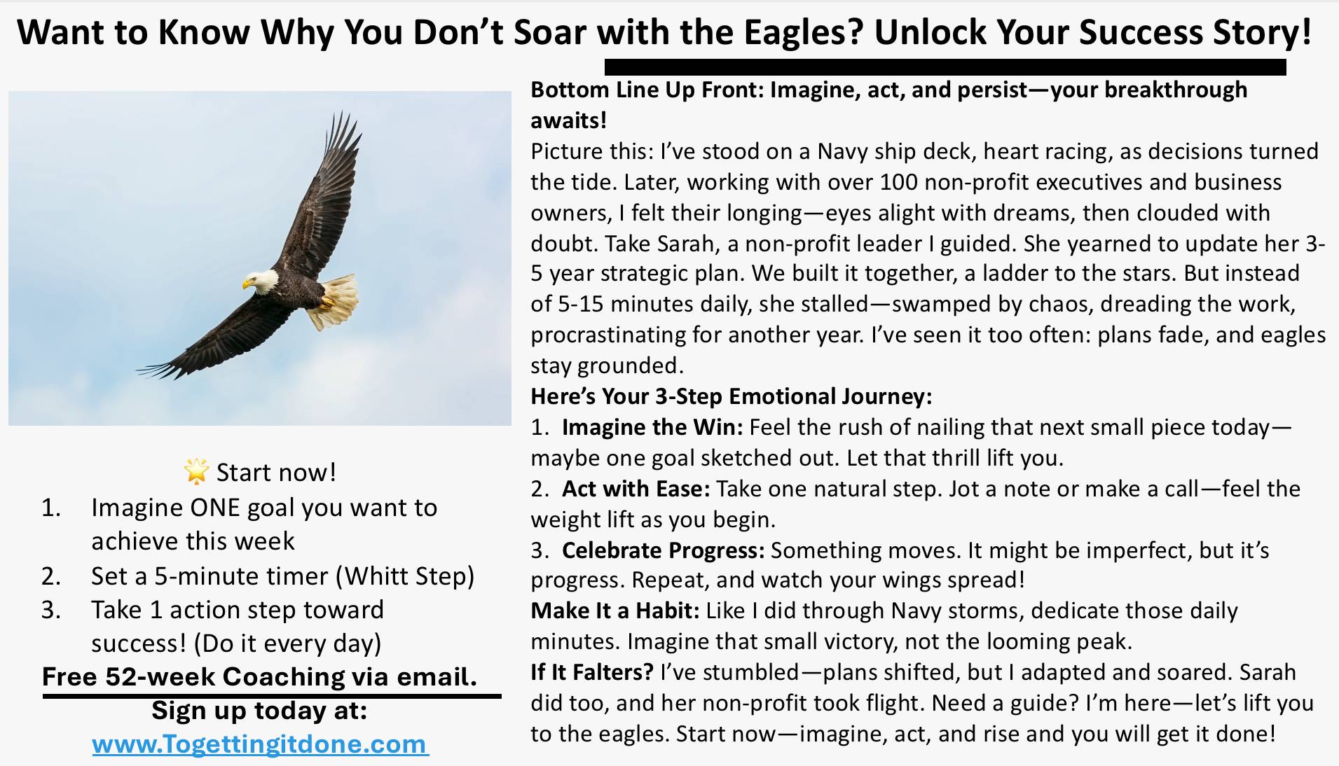 Hi Reader, Have you ever wondered why you’re not getting the results you want or why your process isn’t working? Look no further. Below is our newest Recipe For Success Tool you can use to Imagine, Act, and Persist. Please give it a try and see if it helps you soar with the eagles. Have a super weekend! Best, Michael To Getting It Done! P.S. Empowering Emerging Leaders to Crush Goals with Navy-Honed Processes! • Free 30-min Zoom coaching: https://calendly.com/michael-togettingitdone/30min •...