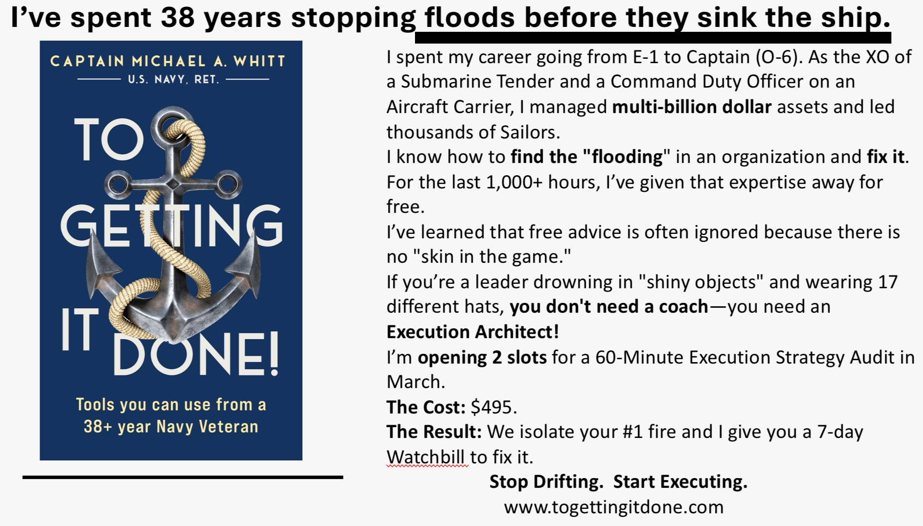 38 Years of Navy Execution. I’ve Seen Every "Flooding" Scenario. I spent my career going from E-1 to Captain (O-6). I’ve managed multi-billion-dollar assets and led thousands of Sailors. I know how to find the "flooding" in an organization and fix it. For the last 1,000+ hours, I’ve given that expertise away for free. I’ve learned that free advice is often ignored because there is no "skin in the game." If you’re a leader drowning in "shiny objects" and wearing 17 different hats, you don't need a coach—you need an Execution Architect. I’m opening 2 slots for a 60-Minute Execution Strategy Audit in March. * The Cost: $495.* The Result: We isolate your #1 fire and I give you a 7-day Watchbill to fix it. Stop Drifting. Start Executing. WWW.TOGETTINGITDONE.COM